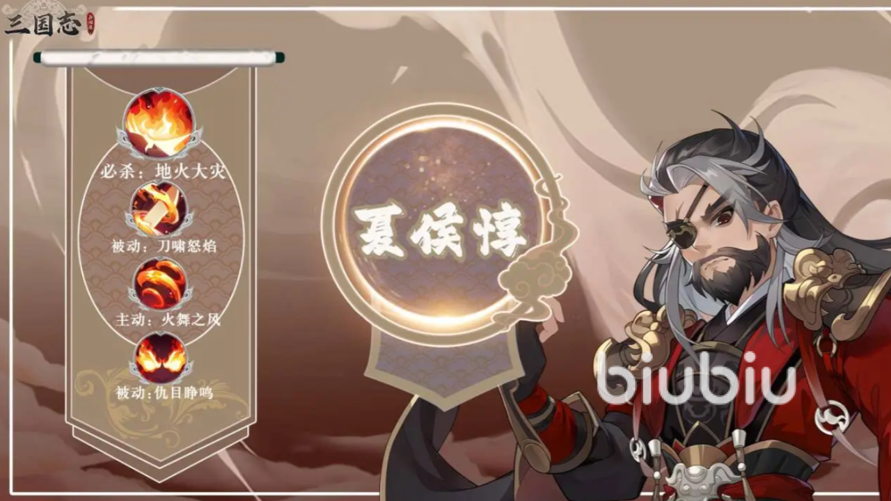 夏侯惇的被动“仇目睁鸣”能在遭受伤害的时候,有44.3%几率获取到1层“刚烈”状态,持续整场战斗,最多可以叠加5层,他的主动技“火舞之风”会对敌方的单个敌人造成一定伤害,并且有59.3%几率会对目标施加上防御降低状态,持续3个回合。