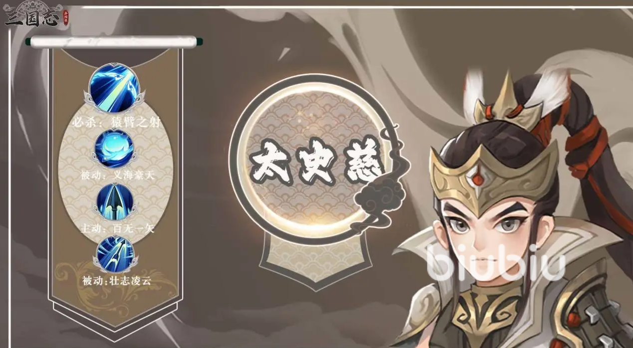 首先太史慈的普攻是进行定向输出,并降低目标的治疗效果,必杀可以伤害到地方横排的全部敌人,并且还能无视部分防御属性,减少目标的怒气值,他的被动能在造成伤害时有概率让敌人血流不止,降低敌人的受治疗效果。