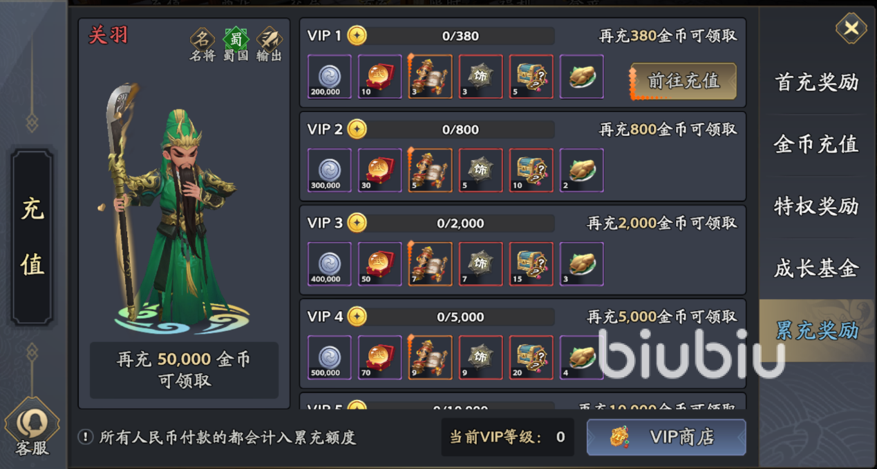 还有一个收费点也很值得,就是首充礼包,这个游戏的首充是武将诸葛亮,达到一定的累充数值还能解锁关羽武将,这些武将都是游戏核心阵容中非常关键的武将,而且也都是很值得重点培养的角色。