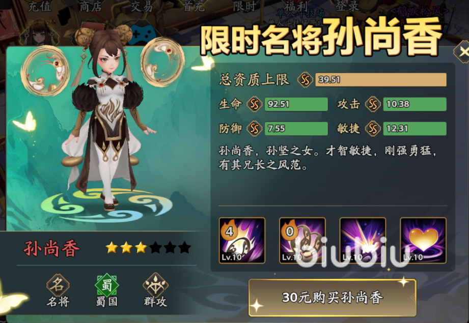 在其余的收费点上就是武将了,在玩家上线后会有限时的武将购买折扣,当下版本是孙尚香,这个武将在技能上擅长群攻,这样技能无论是在刷图还是刷副本的时候都是很重要的技能,因为对战时基本上都1个精英怪+多个小怪的模式,群攻技能可以快速清理小怪。
