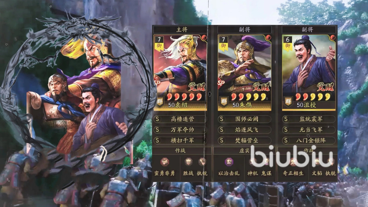 玩家如果想在前期增强爆发力,不妨用T0群攻阵容,武将组合是sp袁绍加上sp朱儁和沮授。在所有的群攻体系阵容中,这一组配队的胜率几乎无出其右。在配置方面主将可采用掣刀斫敌产出卧薪尝胆,兵书可考虑蛮勇、战胜和执锐。sp朱儁的战法应该使用焰逐风飞和焚辎营垒,兵书推荐以治击乱,另带神机和将威。最后一位副将则用无当飞军、八门金锁阵,兵书用奇正、文韬和执锐。如果小伙伴缺乏sp朱儁,可使用普通朱儁去进行替代,在战法层面,采用无当飞军和太平道法,沮授则带八门和克敌制胜。