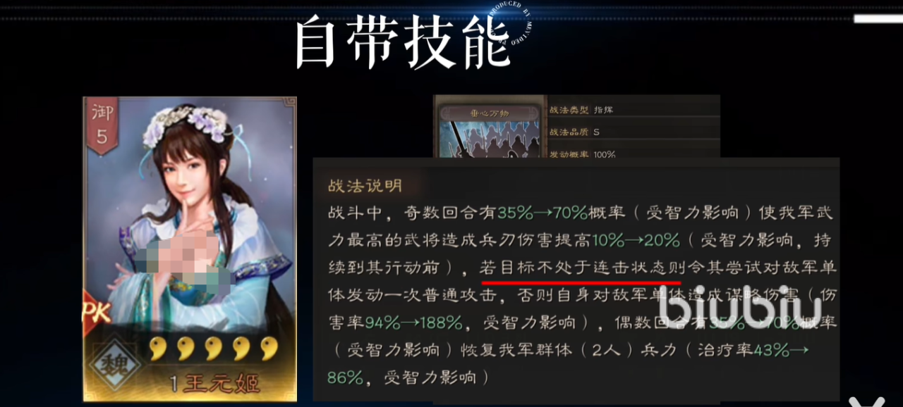 偶数回合王元姬战法可以恢复我军2人,治疗率43%,智力影响。该治疗方法可以给队伍提供持久作战的能力,在敌人长时间进行消耗战的时候特别适用。虽然她的治疗效果比其他的专门治疗武将要差一些,但是她增伤加治疗的组合在所有的战斗中都有所贡献。王元姬的战法机制使她和高输出的武将搭配在一起的时候,既可以提高队友的攻击强度,又可以给队伍提供必要的生存保障。