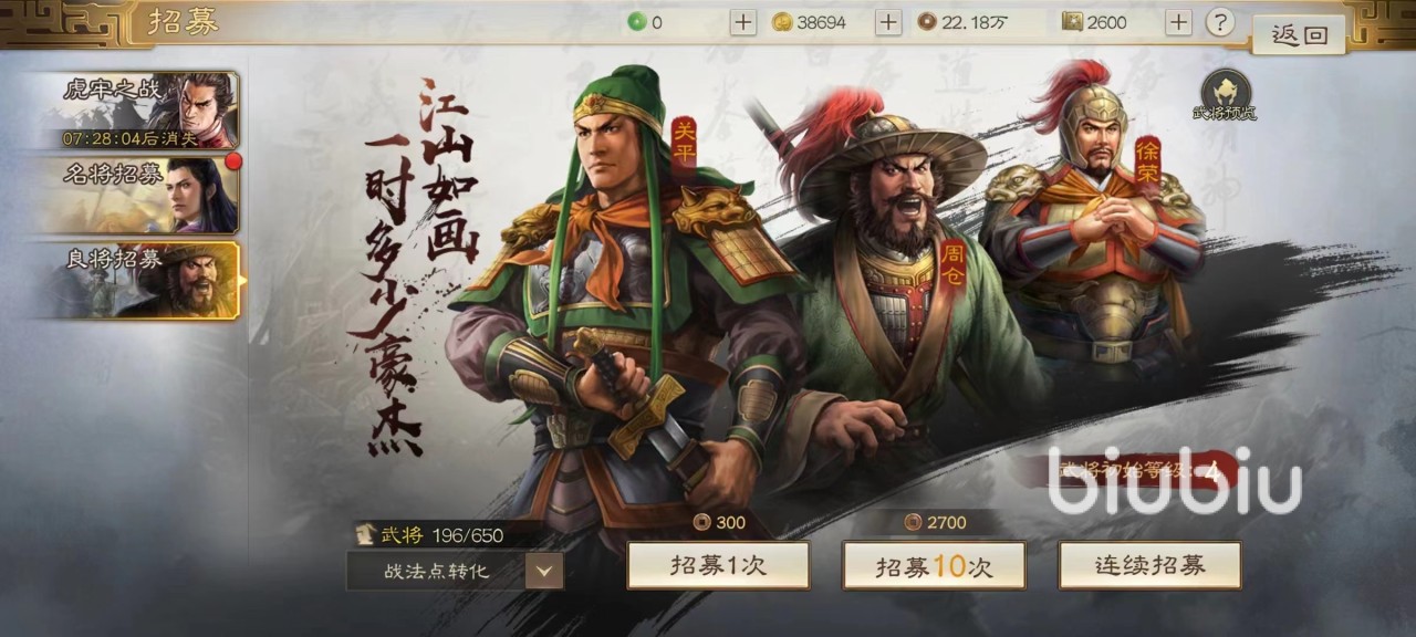 周仓,关羽的护卫,为人忠义。战法推荐“豺狼当道”,可以范围内的敌人都造成兵刃伤害。