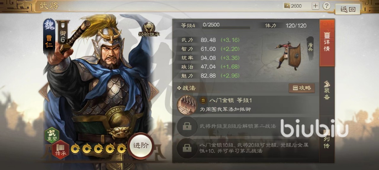 关平,关羽的儿子,后人称之为关圣太子,游戏里的武力值也不错。战法可以用乘虚而入,能够降低统率、造成高额的兵刃类单体伤害,还有一些增伤效果。