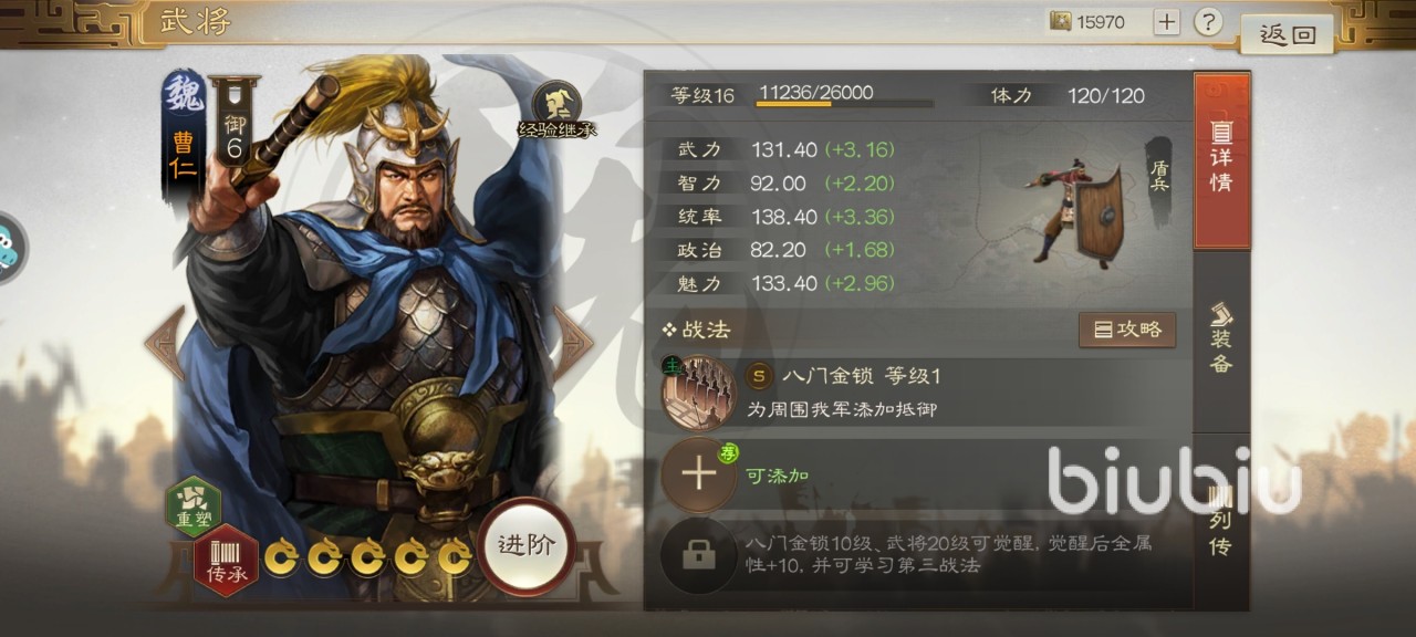 一个武将可以携带包括自己的技能以内的三个技能,另外两个技能就需要玩家学习或者传承其他武将的战法了,比如曹仁的自带技能【八门金锁】是盾兵的辅助技能,可以给这个角色的其他两个技能学习或者传承【御敌屏障】增加自己的坦度,或者学习【千里驰援】增加辅助援护的力度。黄忠是玩家七日签到可以获得的金色名将,自带【百步绝缨】被动增加自己的射程和伤害,可以搭配【困龙缚虎】额外增加伤害保证这个角色的远程输出的力度,学个【急袭促击】可以连射两次,虽然单次伤害有所降低但是整体的伤害是有了飞跃性的提高的。