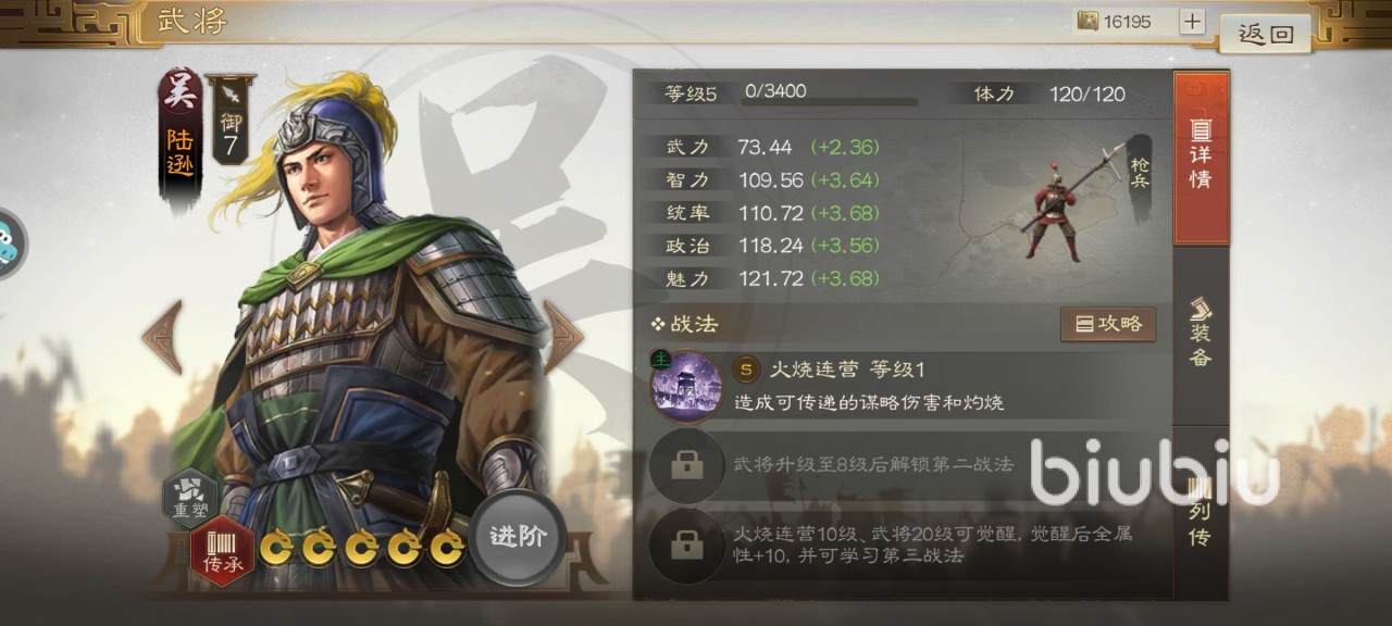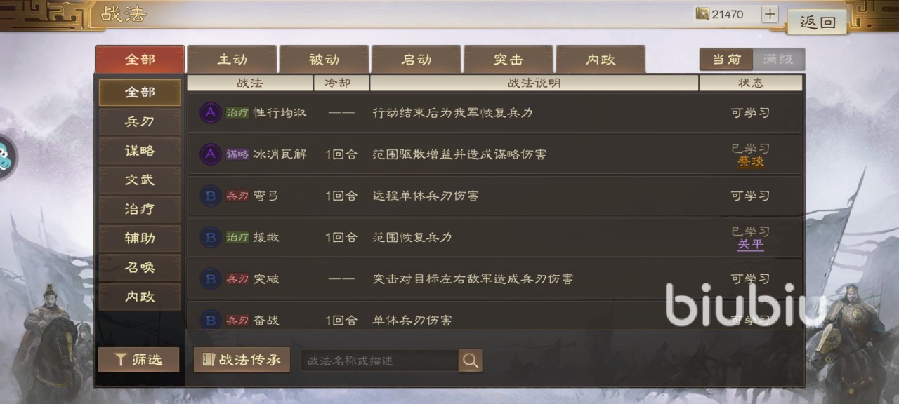 首先是战法的品质区分,游戏当中能用的战法就是A级别和S级别的战法,这些战法可以给玩家带来实质性的改变,A级别的战法是游戏的主流,玩家可以在一些紫色武将身上看到而且还能在商店的史官馈赠当中兑换到这些战法,例如紫色的武将蒋欣就是擅长使用火攻战法【天降火雨】可以造成兵刃伤害以及【烧灼】的效果,大家打开自己武将的战法介绍还能给自己的战法提升等级,每次提升等级之后战法的伤害加成会有明显的提高,但是需要消耗战法点,战法点需要玩家将武将分解才能得到,一般都是分解低级的蓝色武将和赠送的骁城卫这类角色,前期异常的紧缺建议使用金铢双倍转化。