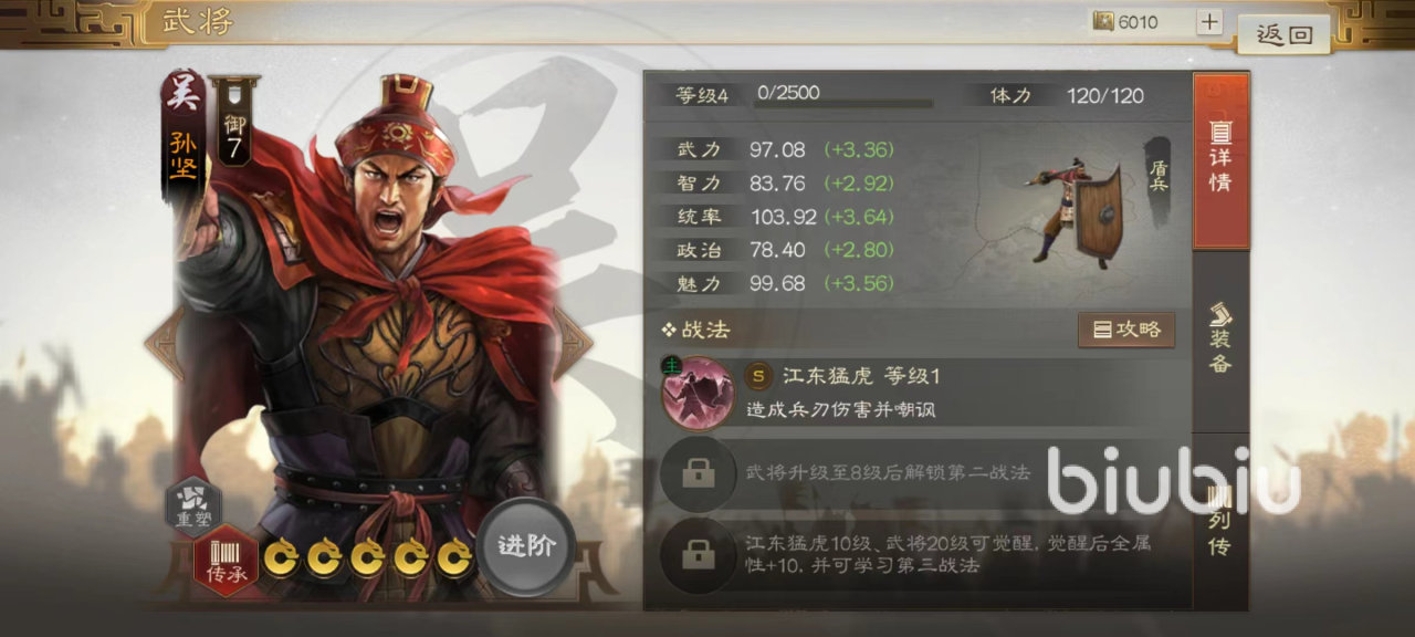 在对孙坚进行战法搭配和阵容组成的之前,需要先了解他自身的定位和特点,从面板属性中可以看出孙坚拥有极高的统御值和优秀的武力值,这就使得在攻守两端都有非常出色的表现。再加上自身属于盾兵型武将,天生就适合防御,这就使得孙坚在绝大多数阵容中都是作为前排肉盾,利用防守反击来打输出和抗伤害。