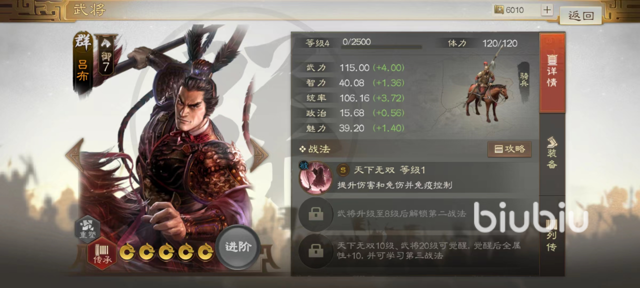 吕布作为一名骑兵武将,要想上阵需要消耗7点御值,这就注定了属于后期才能发挥的角色,不然就容易造成阵容上的缺失。从面板属性来看,绝对是当前武力值最高的一名角色,无论是初始的115点还是4点的升级成长,都是吕布拥有冠绝天下的普攻能力和兵刃输出能力。此外在统御方面也达到了顶尖水准,这样在攻击和防守两端,吕布都做得极为出色,单从属性上就值得大家投入大量资源。