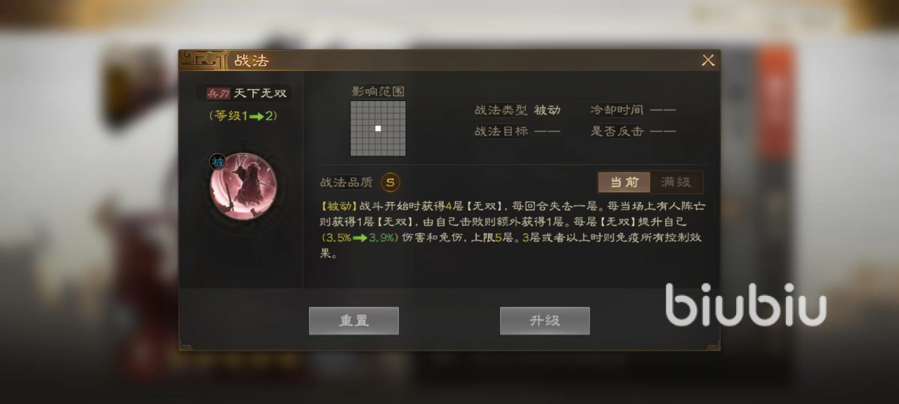 毕竟评价一名角色,战法可以更改但属性成长无法提升,况且吕布的自带战法也很强势。自带战法天下无双,属于被动型S品质战法,在战斗开始时,吕布自身获得四重无双效果,随着战斗继续每过一回合会逐渐失去一层。如果场上有武将阵亡则自动再获取一层,这里无论是己方还是对方武将阵亡都可以获得,如果敌方阵亡武将是吕布自己击败,可以额外叠加一层。每一层无双可以提高吕布的伤害和免伤,最高能叠加到5层,一旦叠加到三层以上可以免疫所有的控制效果。