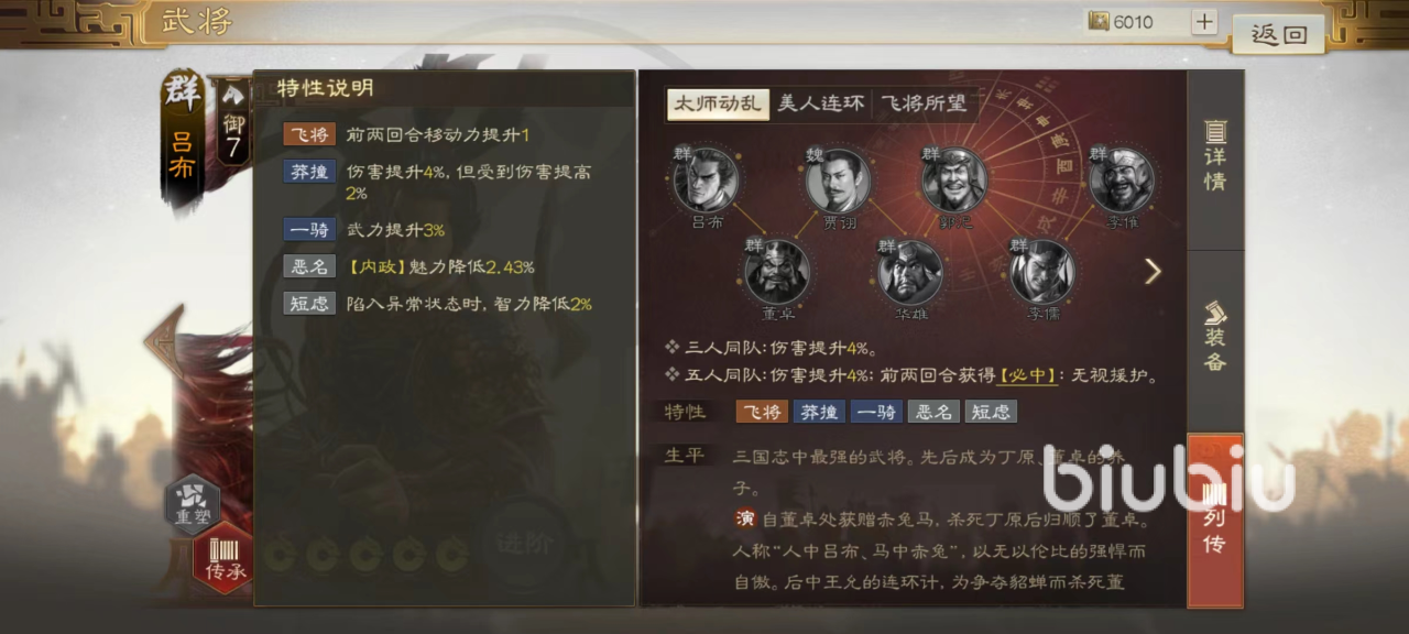 强势的吕布也需要有良好的阵容,吕布最好的队友当属貂蝉和董卓,此三人一起出战可以获得全属性提高效果。并且依靠董卓的肉盾更好的帮助吕布去发挥,此外可以添加上华雄、李儒这样的群雄武将,或者是张辽、陈宫,都有很好的发挥。