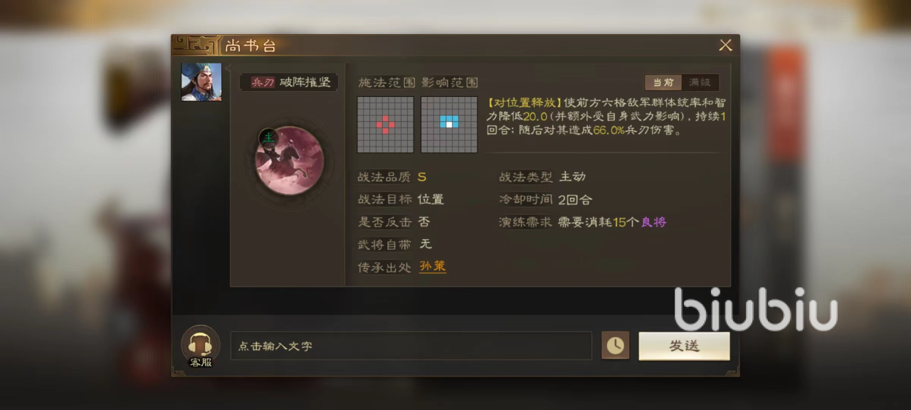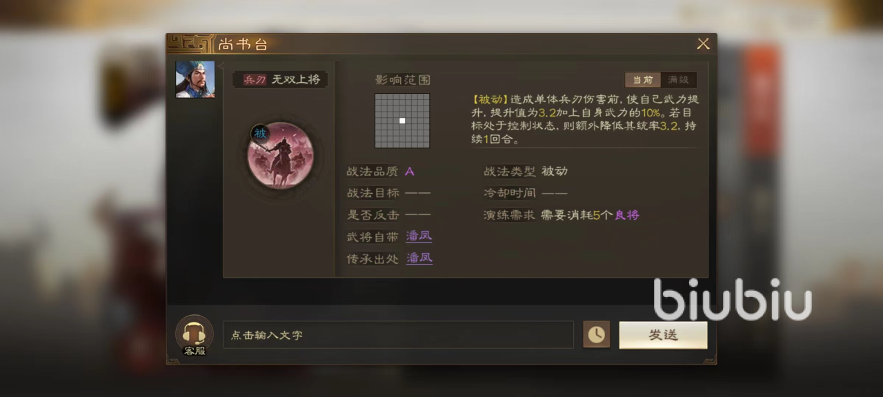 破阵催坚可以伤害到前方6格敌军武将,并且降低他们的统率值和智力,降低统率相当于削弱了防御,方便后续继续输出。所向披靡可以对周围一格以内的敌军群体造成直接兵刃伤害,充分利用了吕布武力成长高的特点。也可以利用横扫千军,力挽狂澜,无双上将等战法替代。尤其是无双上将,虽然是紫色战法,但是可以提高武力值,并且对处于控制状态的目标有额外伤害,非常适合吕布选择。