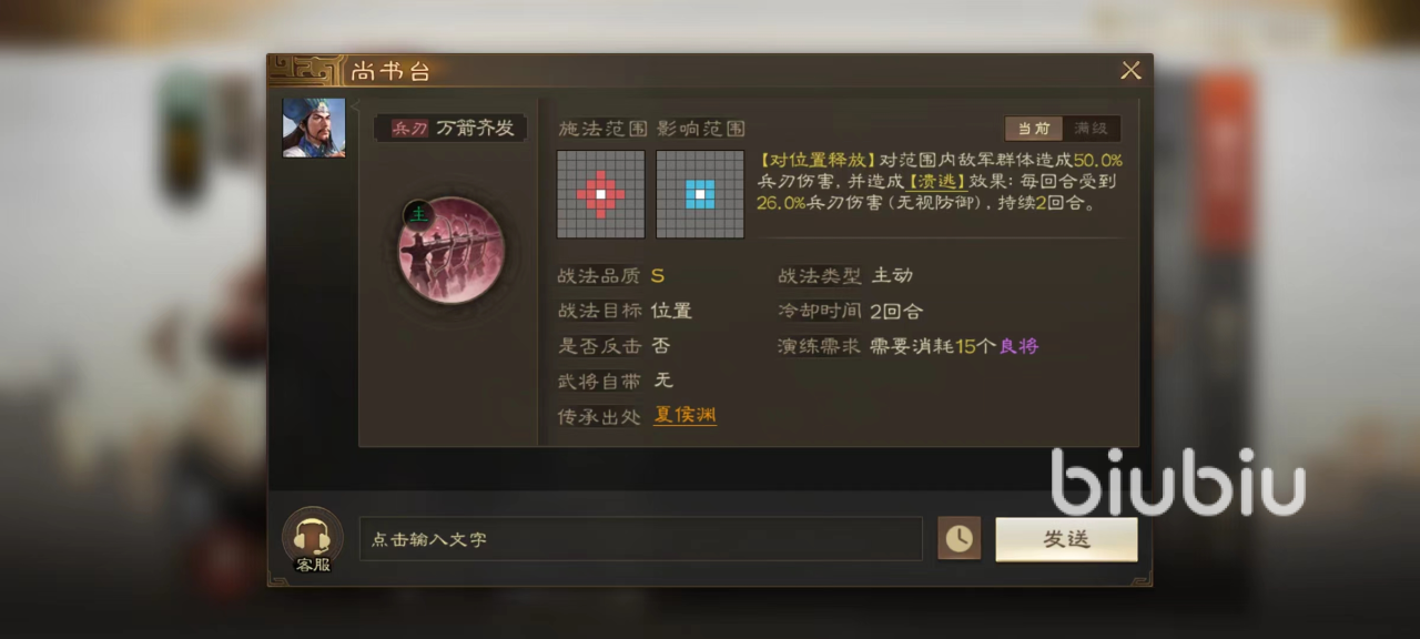 在其他战法搭配上,小编推荐选择万箭齐发和断粮绝草这两个,万箭齐发在选中后对范围内的敌军群体造成兵刃伤害并且附加溃逃效果,被溃逃所影响的目标受到持续的无视防御伤害,持续两个回合。此技能本身影响范围比较大,再加上百步绝缨的范围提升,在黄忠手中真正成为了神技。而另一个断粮绝草的是可以施加断粮效果,对断粮影响后受到的治疗降低。