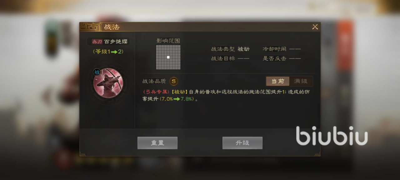 这里小编想要普及一下施法范围,作为一款战棋类游戏,将战场划分为一个个方格,每一个武将都有自己的攻击距离和施法距离。如果施法距离或攻击距离过近,就需要先移动过去再攻击,如果施法范围远,就可以在很远的地方直接使用,这样对方就无法攻击到更加安全一些。黄忠有了这一效果就使得自身可以在大后排不断输出,对于自身来说相当于创造了一非常优秀的环境。仅这一点黄忠就是非常值得培养的一名输出型武将。
