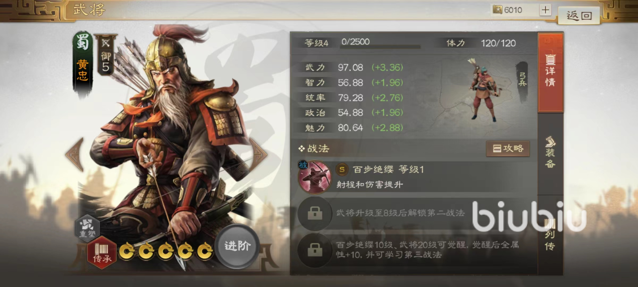 在新开服中黄忠登陆7天之后就由系统直接赠送获得,在这一时期玩家虽然手中已经有了一些橙色武将,但是黄忠依然是很重要的一个。拥有统御值比较少的优势,这样就能在更早的时候发挥出作用。而且自身面板属性也非常可观,属于弓兵型武将,自身武力值无论是初始数值还是成长都非常优秀,虽然达不到顶尖级别,不过依然在中上水准。最重要的是自身携带的被动战法百步绝缨,可以使自身的普攻和远程战法的施法范围提高一格,造成的伤害也同步提升。