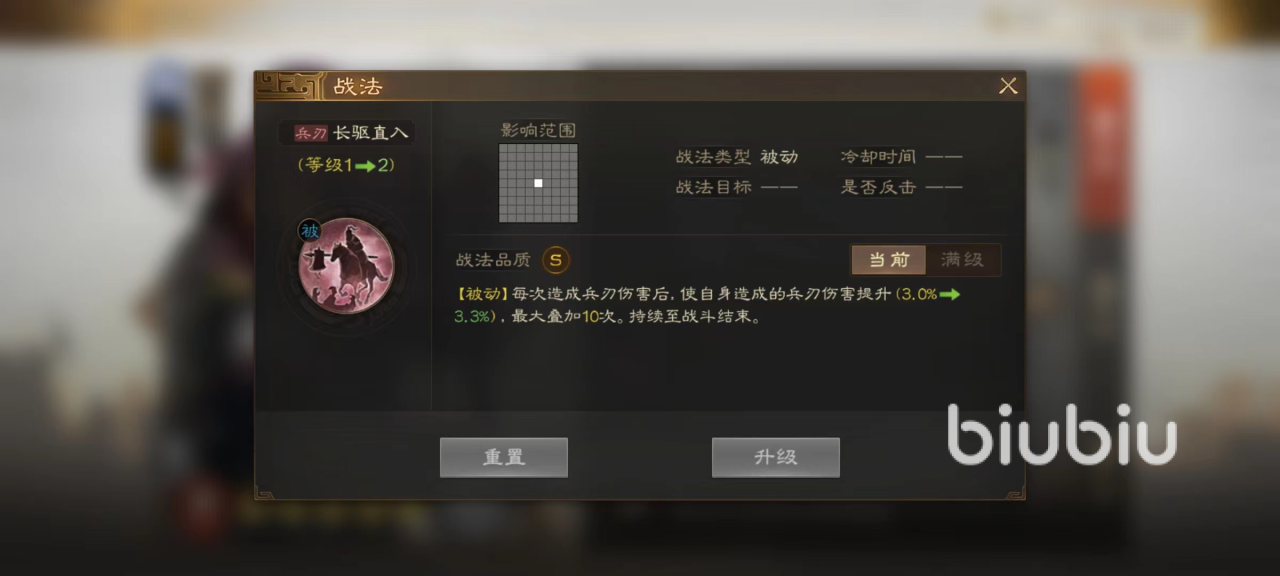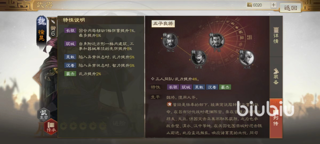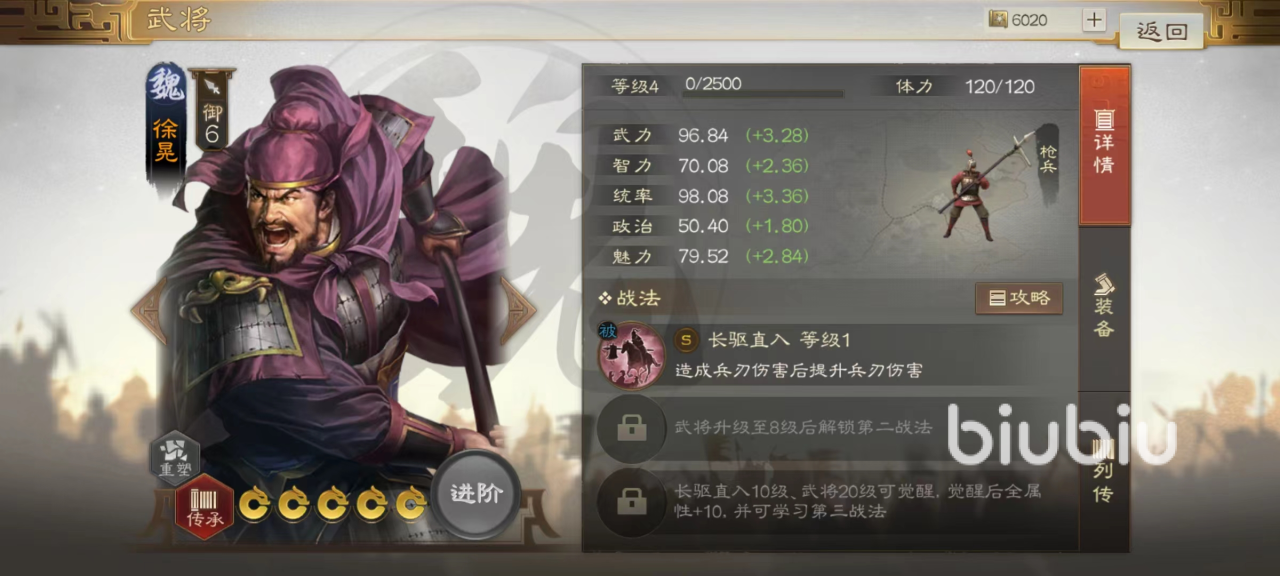 如果想要更好的使用徐晃,需要先了解这名武将的特点,从面板属性中可以看出,自身作为一名枪兵天生就有造成伤害的优势,再加上武力值和统率值这两项属性也极其出色,这样在成长潜力方面也完全没有问题,兵刃输出和各项防御到位。自身战法长驱直入属于被动类型,每次造成兵刃伤害后,都能使自身的兵刃伤害获得提升,当技能达到满级时每一次叠加都能提高6%,最大可以叠加10次。