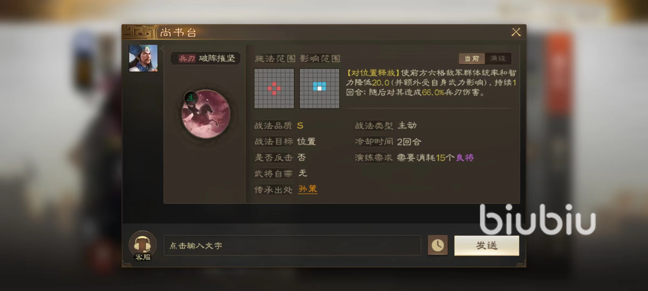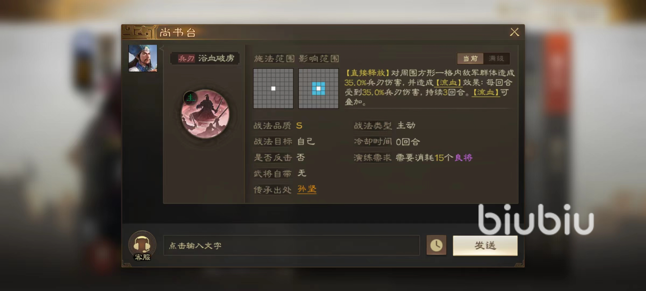 破阵催坚在释放之后可以使前方6个范围内的敌方群体武将降低智力和统率值,随后附加一次兵刃伤害。这一战法非常适合走持续作战路线的徐晃选择,整场下来能够降低对方不少输出和防御。浴血破虏在释放之后可以使周围范围内的敌方目标受到流血效果影响,流血属于持续伤害类型可以叠加,使得对方在每个回合都受到兵刃伤害。而这两个战法就使得徐晃的持续作战能力再上升一个台阶。