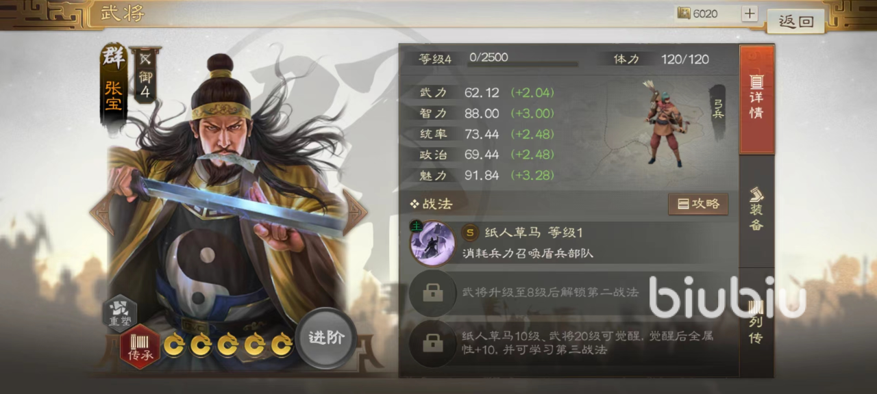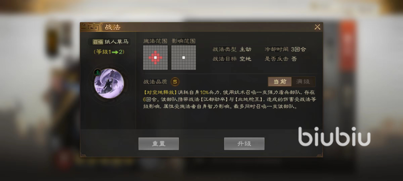 从面板属性中来看属于弓兵型将领,这样也就有了主动战法伤害加成和射程比较远优势。这些在一定程度上弥补了其智力属性不高问题。虽然智力初始值和成长都属于中等程度,但有了这一项加成在输出方面也并不落后。自带战法纸人草马,小编非常喜欢这一个战法,在释放时候选中一块空地,以消耗自身兵力为代价召唤出一只强力盾兵部队,此部队将会存在6个回合。并非只能进行普通攻击,还拥有江都劲卒和北地枪王这两个技能。战法等级越高则召唤出来纸人草马造成伤害也就越高,同时只能召唤出一支部队。