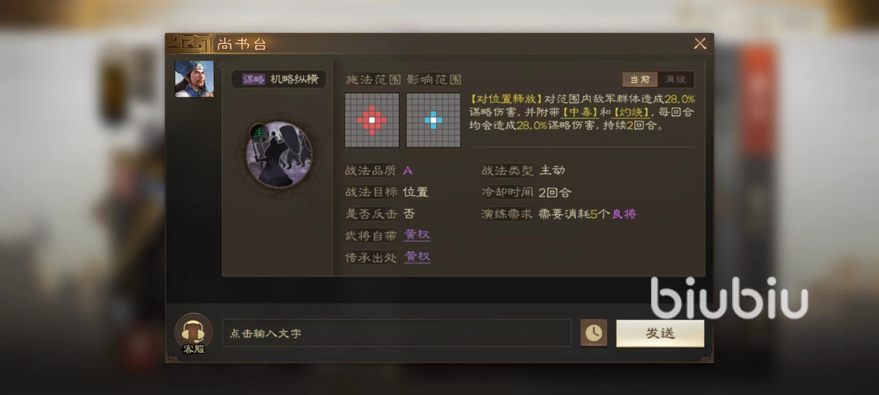 撒豆成兵是其自身分解出来的技能,在获取上有些难度不过非常切合自身情况,能够再召唤出另外一支枪兵部队,同样拥有战法和受等级以及智力影响,这样有两个召唤出来的部队就能更好去分担伤害,也能给敌方带来比较大的麻烦。机略纵横伤害虽然不高,但是能附加中毒和灼烧效果,这样使得张宝在搭配组合的时候就能适应更多阵容。