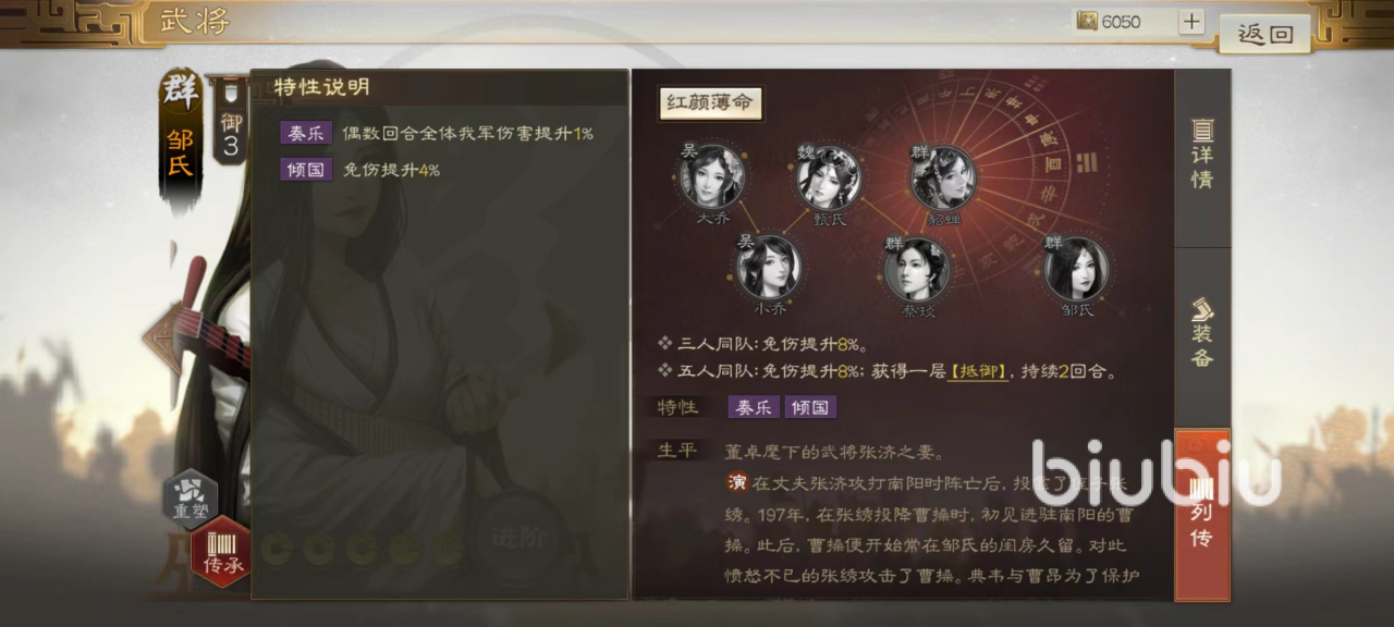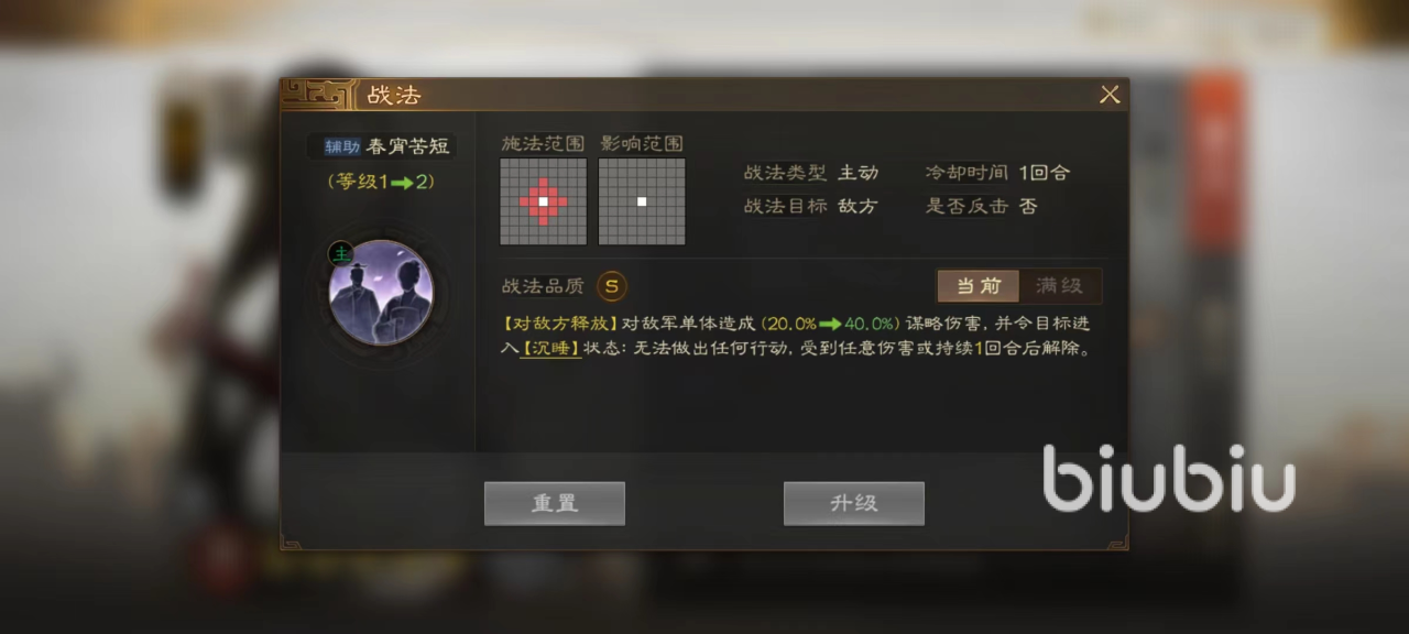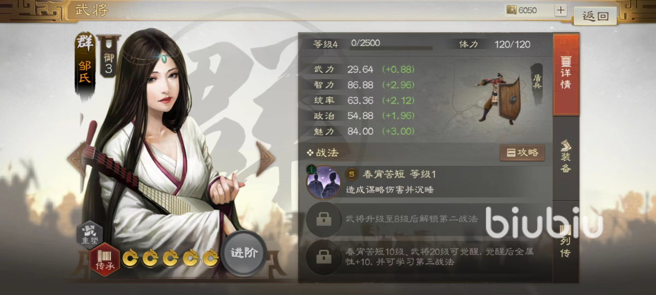 大家即使在抽卡的时候抽到自己不熟悉的武将也千万不要先入为主放在一旁,而是要了解一下具体情况和战法以及能够发挥出的作用再做决定。对于邹氏这名角色,从属性来看拥有不错的智力属性以及成长值,在魅力方面也能够当做内政型武将使用,这样能保证基本出场机会。自身战法春宵苦短,对敌方单体目标造成谋略伤害后能令其进入到沉睡状态,持续一回合或者是受到攻击后解除,沉睡是非常好用的控制状态,被控制住之后无法进行任何行动。