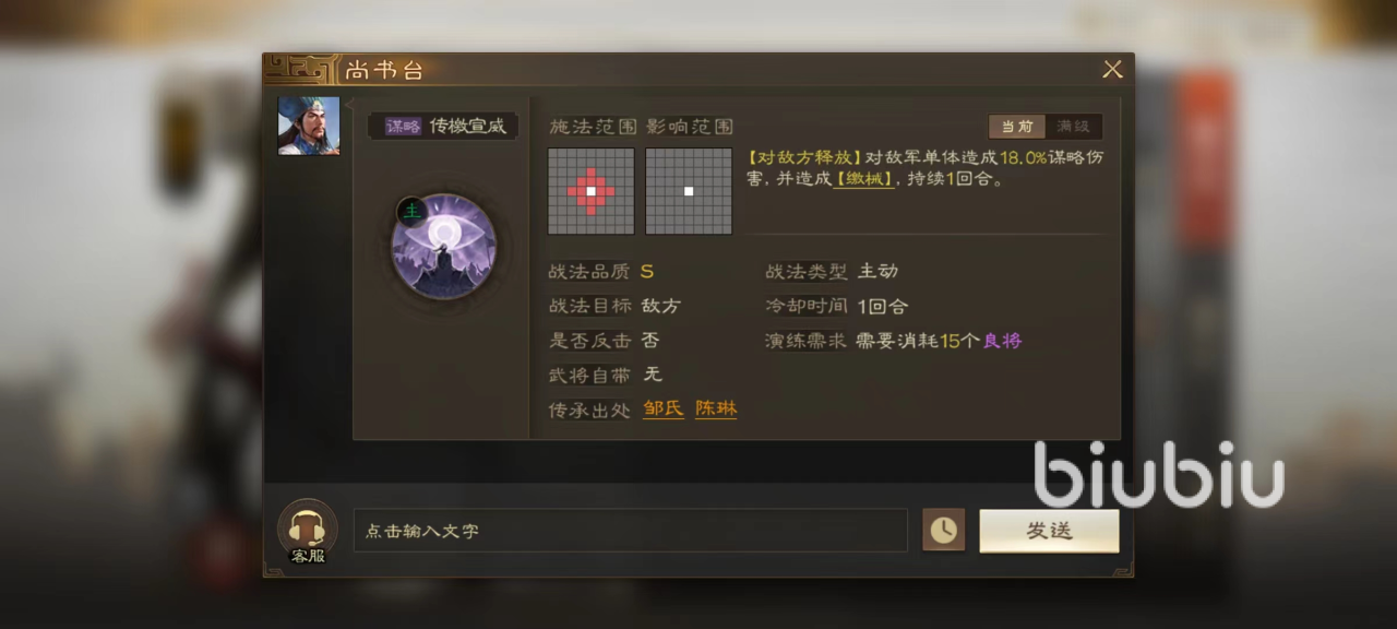 为了强化控制能力,真正做到限制敌方关键角色的作用,小编在战法搭配上选择的是传檄宣威和兵疲意阻这两个。传檄宣威效果是对敌方单体造成缴械状态并且附加谋略伤害,被缴械之后无法进行普通攻击也能够限制对方输出和使用被动战法。兵疲意阻能够伤害敌方之后附加降低移动力效果,移动力降低之后就不能随心所欲移动,尤其是对骑兵限制最为明显,极大降低了对方突进来的机会。