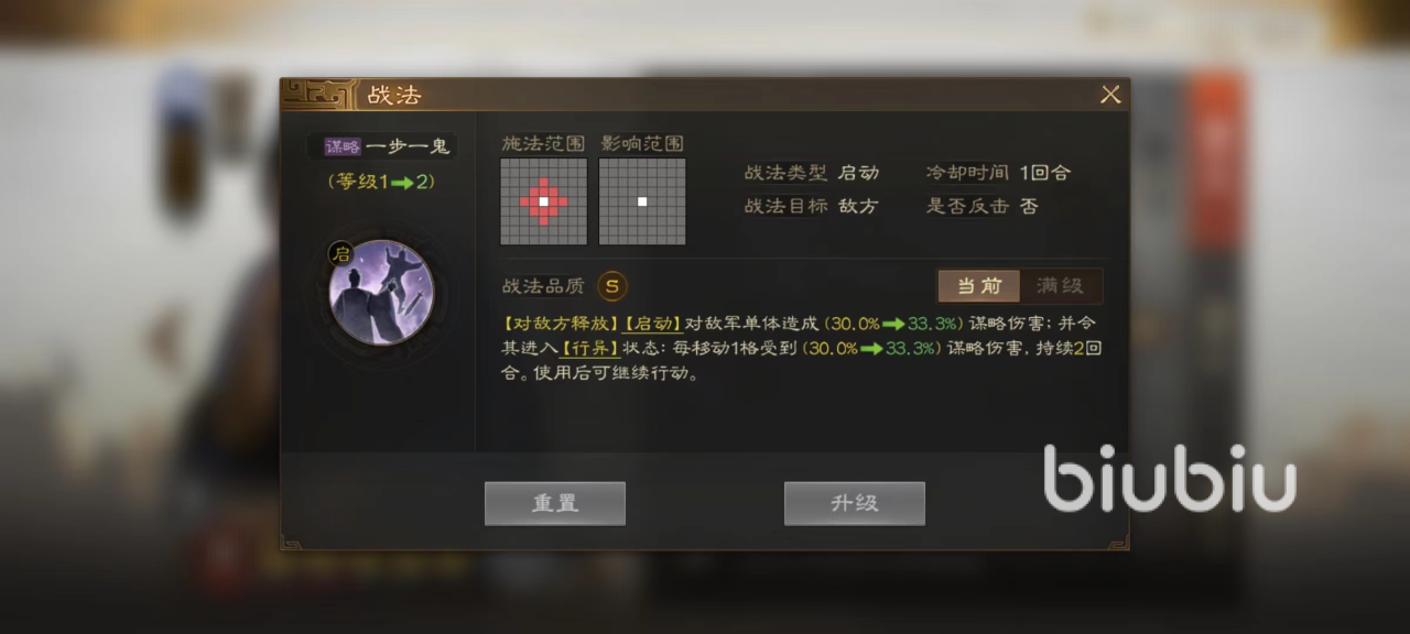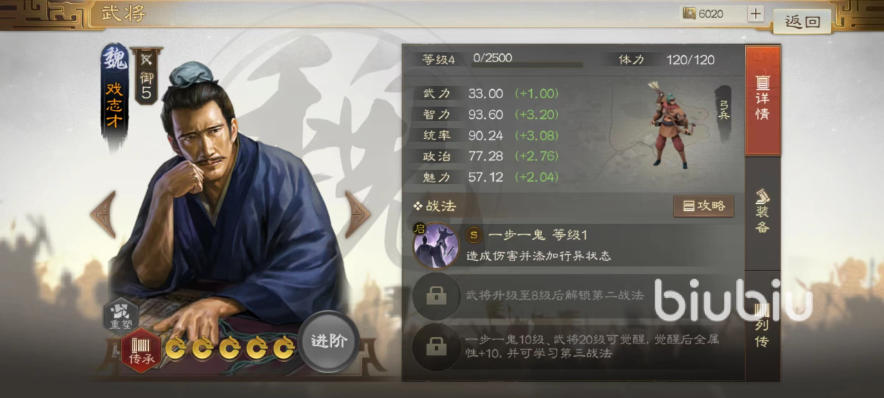 从属性来看智力虽然没有达到一流水准,但是也完全不影响输出。自带战法一步一诡,当对敌方释放时可以造成一次单体谋略伤害,同时使伤害目标进入到行异状态。此状态能够很好限制对方的移动,目标只要移动一格的范围就将受到一次伤害,对于一些移动力超高的骑兵型武将更是有着极大限制作用,冲锋距离越长,受到伤害也就越高。并且此技能在使用后可以继续行动,不占用回合。