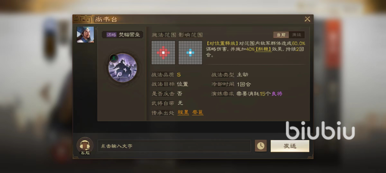 焚辎营垒效果是造成一次群体伤害后添加断粮效果,被断粮所影响的敌方武将受到治疗时,兵力回复会受到影响,也就相当于削弱了对方治疗作用。石室清野同样是造成群体伤害,能够使目标进入到中毒状态,接下来的两个回合持续损失兵力。再加上自身属于弓兵,完全能够利用主动战法伤害加成的优势和射程比较远这一点,在后排去输出。最后在阵容组合方面和其他同属位阵营的谋士一起搭配,能够有谋略伤害提升状态,例如现在最火爆的贾诩,郭嘉等都是很好的队友。