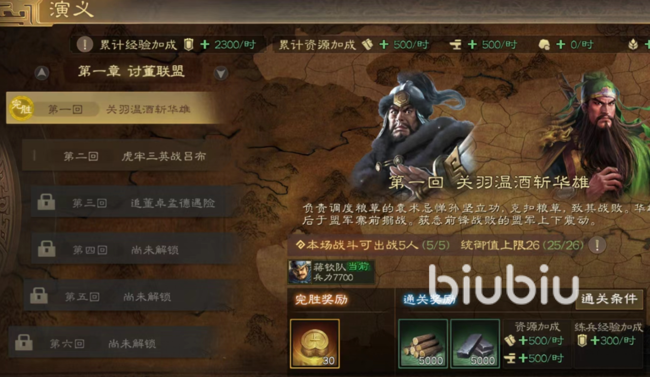 在主界面进入演绎玩法之后,就可以看到不同的章节了,这些章节顺序对应了三国历史的各种战意,每一个章节都有很多小关卡,攻克这些小关卡可以获得丰富的奖励,这些小关卡采用了闯关的模式只能按顺序一关一关的打不能跳关,攻略前一关才能开启下一关。