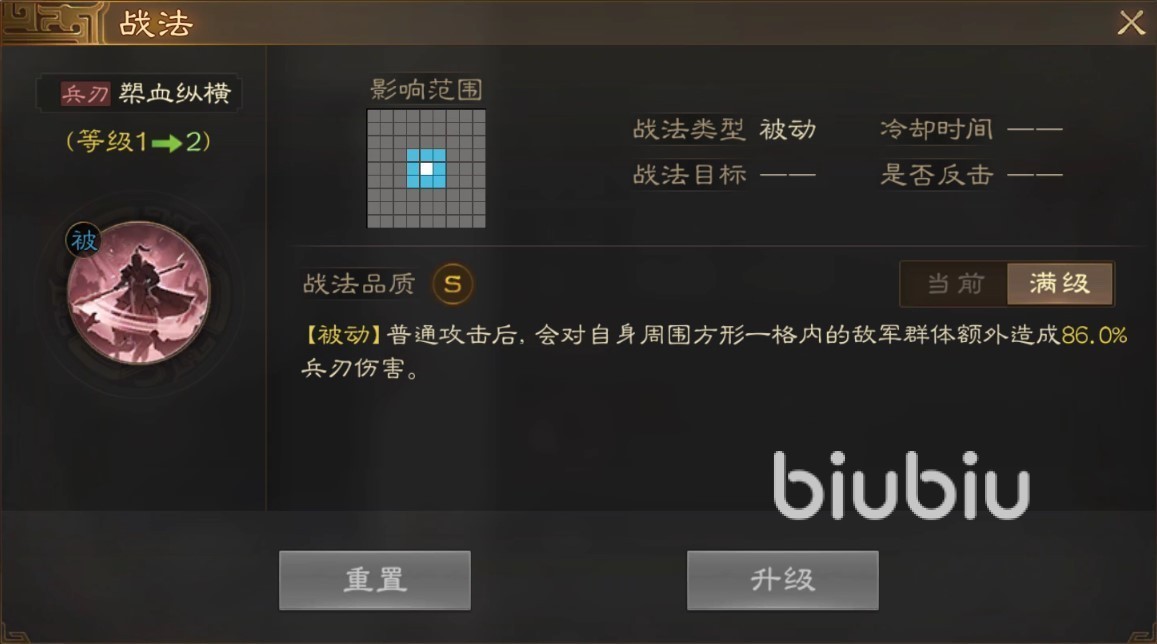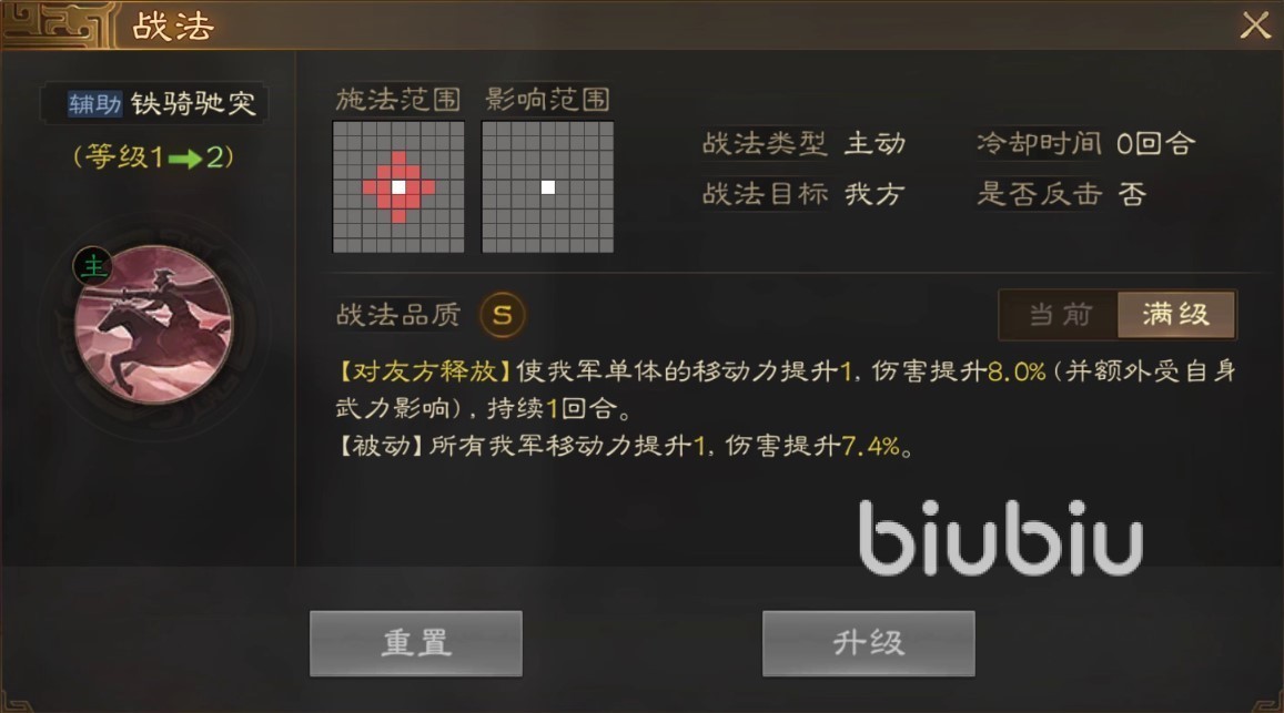 其战法主要的作用就是让己方某个人员的移动能力得到一点提升,并将其伤害提升百分之八,这个效果是受其本身的武力值影响的,此效果会持续一个回合。另外还有个被动效果,是让自己队伍中的所有人员都得到移动力还有伤害的提升。