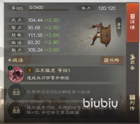 首先是孙坚的属性介绍,属性方面他拥有很高的武力值,在初始阶段武力值就有100多点,后续的成长也有3.36,统率和魅力方面孙坚的属性也很不错,分别有着3.64和3.56的成长度,稍微低一点的就是政治和智力了,不过问题不是很大,毕竟孙坚是一个武将,智力政治这种内勤属性第一点没事。