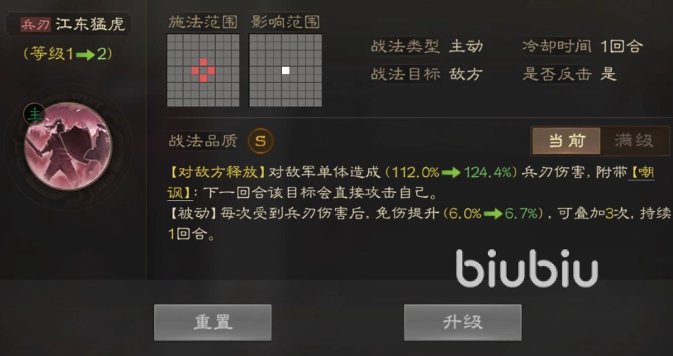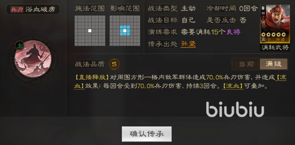 另一个战法也是伤害类型的主动战法,不过这次的效果没有嘲讽,并且还是aoe伤害,释放时可以对附加的敌人造成百分之70的武力伤害,之后还会附带一个流血的效果,这个效果可以让敌方每回合都受到原攻击的伤害,持续三回合,这个效果的离谱程度可想而知,没会和百分之70的武力伤害无法躲避,想起来就吓人。