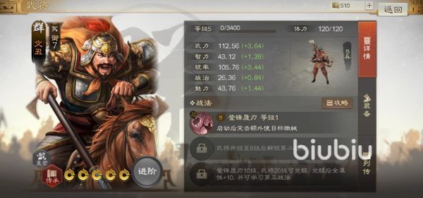 如上面所说,该角色的武力值极高,已经达到了112,在游戏中算是武力值排行较前的一个角色了,他的统率也达到了105,从数值上看,他的强度在游戏中也算是输出方面比较不错的武将。