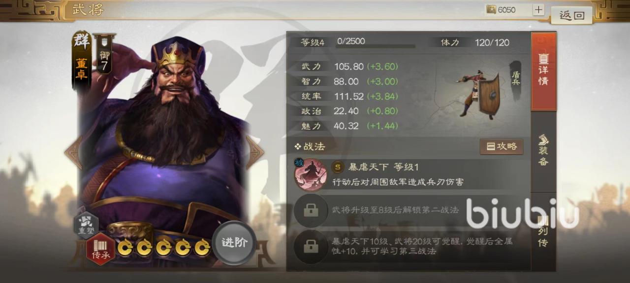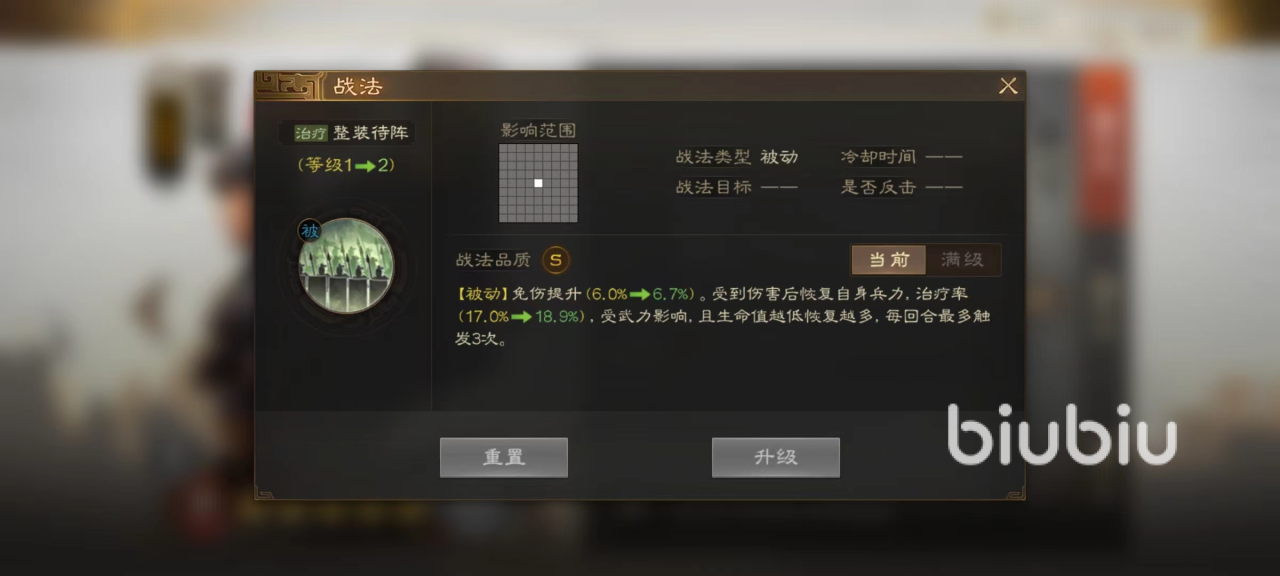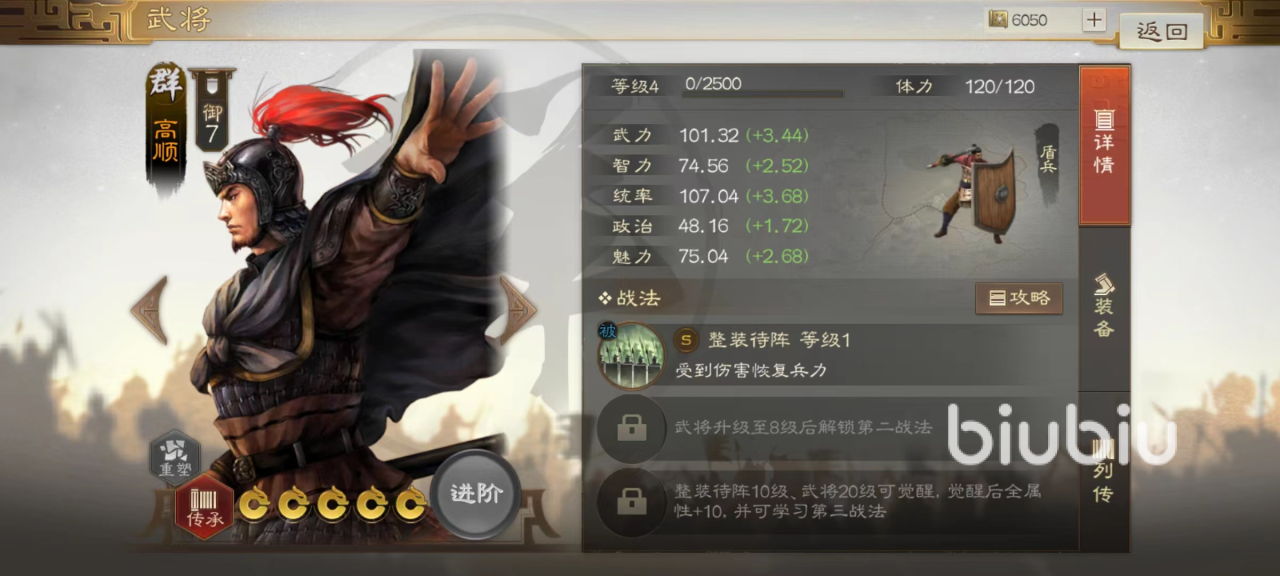 高顺属于盾兵,这一点符合陷阵营特点,而且统率值和武力值都非常出色,统帅还要更高一些,这样就能为其带来非常出色的生存能力。自带战法整装待阵,一旦高顺受到伤害就将获得兵力值恢复效果。并且此技能还能被动提高免伤属性,生命值的恢复受武力影响,血量越低恢复效果也就越好。