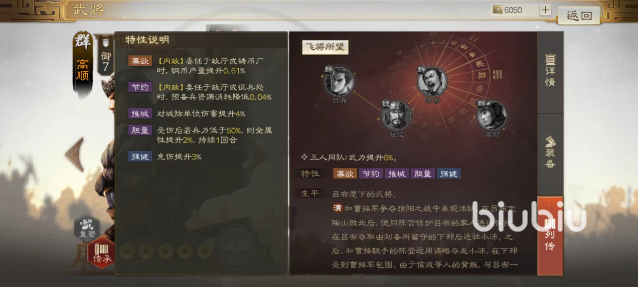 将其放到前排根本不怕对方输出,即使在自己没有治疗情况下也能够扛下巨额伤害,是非常好的前排选择。如果能够获得辅助战法风雨同舟,那么对高顺的提升非常明显。使用之后为友方单体武将分担伤害,被动提高百分比恢复兵力状态,和自己战法叠加起来完全不需要其他人来治疗。阵容搭配方面最佳选择就是和吕布,张辽,陈宫,董卓等一起出战,其中和吕布、张辽等一起可以提高自身武力值,这样不仅战法效果更好,对于另外吕布和张辽也是强势提升。