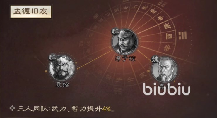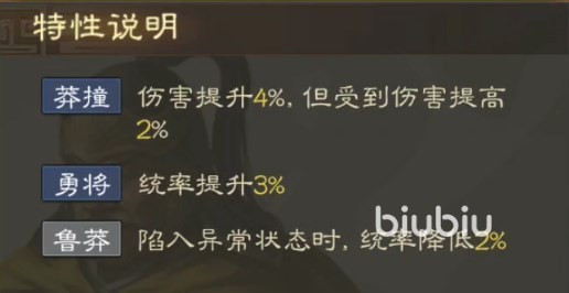 他在游戏中是有同队加成的,各位想要获取到更高武力和智力加成,就可以将其与指定人员放在一起。另外他的特性是能够提升自己的伤害还有统率属性,不过在进入负面状态的时候,自己的统率值会对应下降。