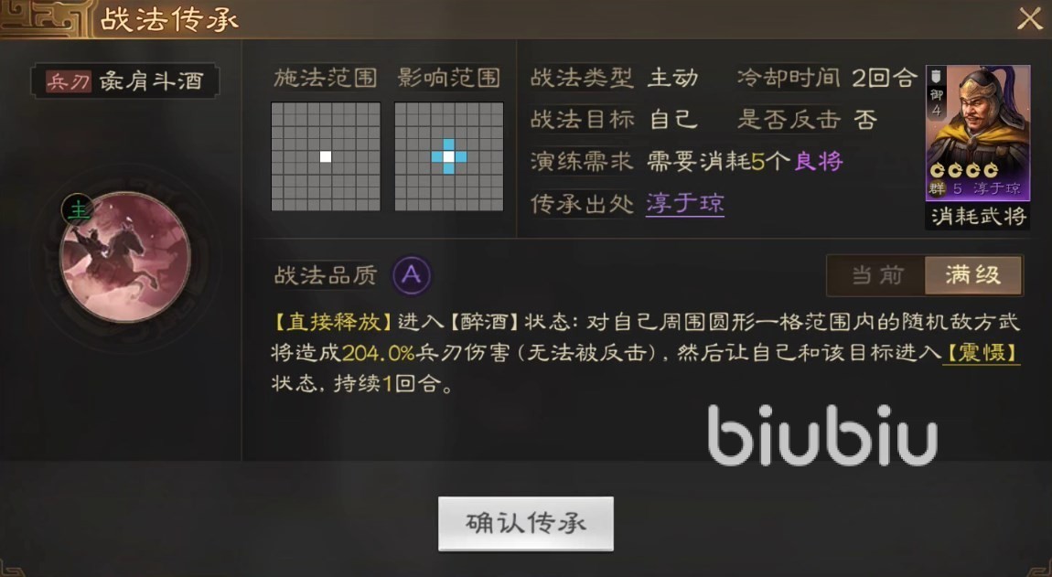 其主要的功效就是可以染角色进入醉酒形态,然后以自身为中心,对周边的一名敌人造成物理伤害,并且这个伤害是不能被反击的,之后还可以让自己和对方都陷入震慑状态,此效果会维持一个回合。