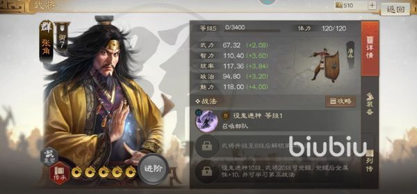 接着往下看就是战法内容,也就是角色的技能效果,等级越高,伤害则会越高。