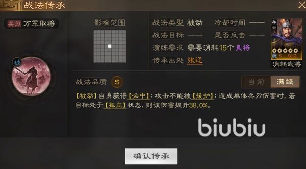 他是魏国的一名大将,主要战法叫做登峰陷阵,可以直接突击到敌军中,然后把敌军击退,当这个技能达到满级之后,突击的话就可以直接获得第一次攻击机会,并且这次攻击是不会受到敌人反击的。