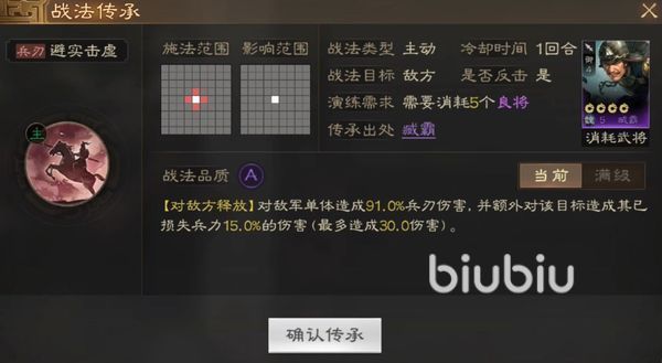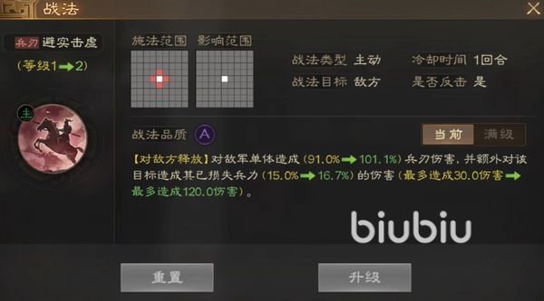 他的避实击虚技能能在一级的时候可以对敌人直接造成91%的兵刃伤害,造成该伤害之后,还能再额外对该敌人造成15%的已损兵力伤害,在一级的时候,他最多可以造成30点的伤害。