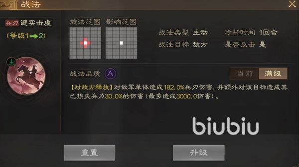 而当该技能达到满级的话,最多可以对目标造成30%的损失,兵力伤害可以对他造成3000点伤害,而且对其造成的兵刃伤害也提升到182%。