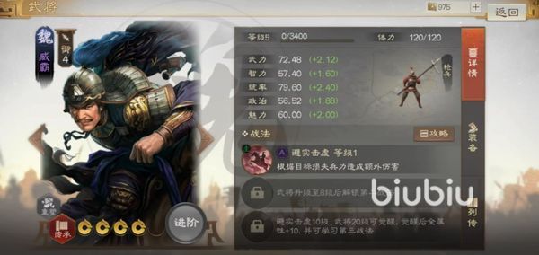 他是一名四星大将,从属性面板中看,他的各项数值都是比较不错的,特别是统率更是高达79,他的兵刃伤害非常高,而且武力值也达到了72,就算普通攻击的话,也能发挥出不错的效果,这个角色的强度是比较不错的,在四星武将里面是比较好用的一个角色。