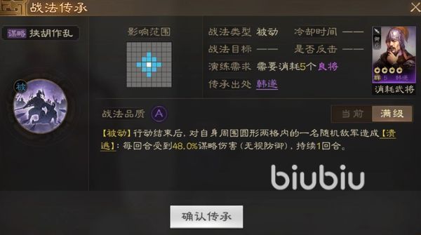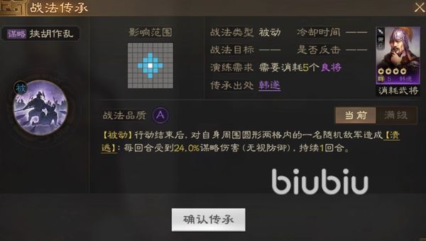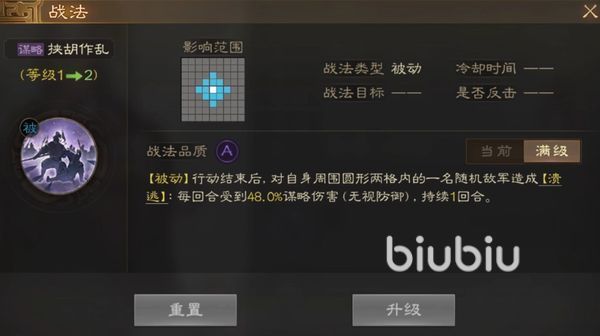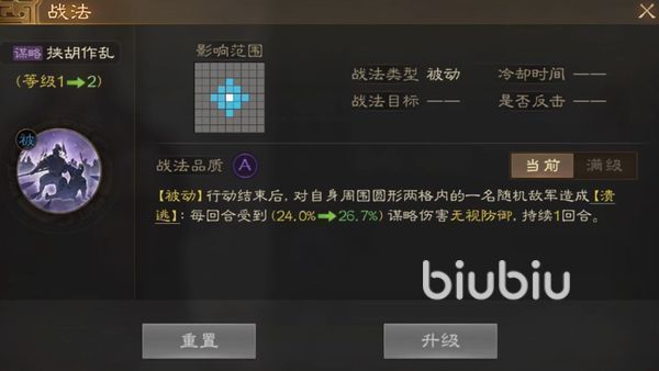 邪胡作乱这个技能在他一级的时候,当角色行动结束就可以对角色身边任意一名敌人造成溃逃效果,让其在每回合都会受到26%的谋略伤害,该伤害还会无视敌人的防御,直接对其造成伤害效果并维持一个回合。