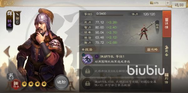 在这个游戏中韩遂他的强度是比较高的,他的武力值达到了77,代表防御的智力值是80,兵刃伤害的统率是90,还有政治为63以及魅力为79,他是还有群雄里面的枪兵,在战法方面邪胡作乱这个技能可以对周边随机的敌人造成溃逃效果。