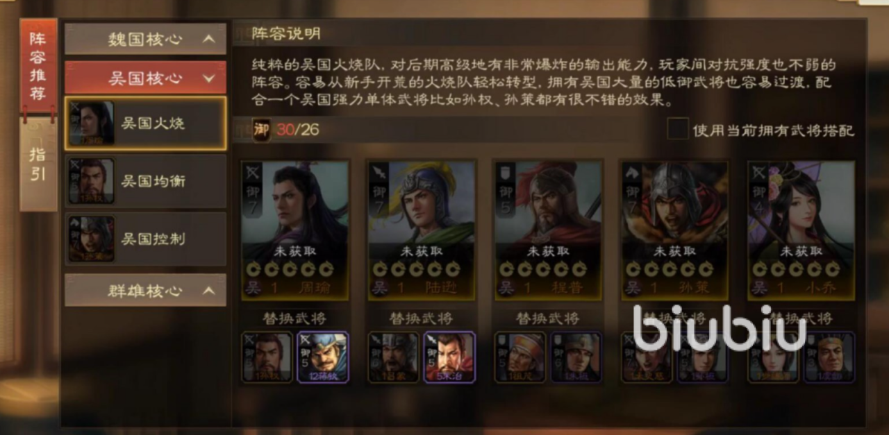 阵容推荐方面,可以进行常规的吴国火烧队中替换程普来大幅度提升队伍的坦度。这样火公的伤害也可以达成最大化。而且作为后期阵容方面,也很容易像其他高阶阵容进行过渡。