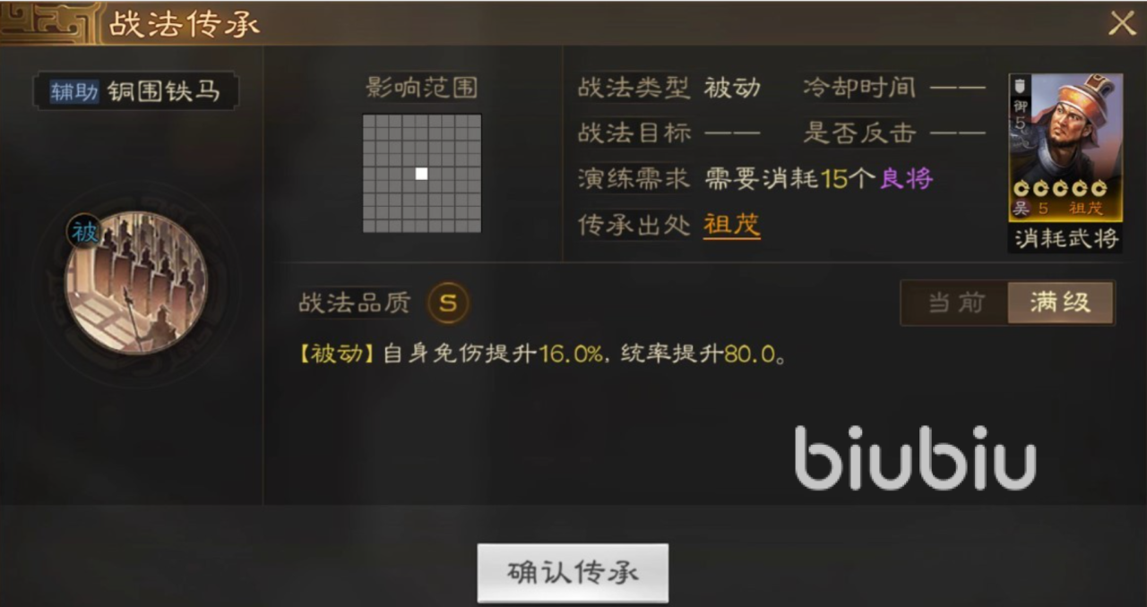 传承战法方面,铜围铁马,是目前所有盾兵当中相当不错,且属性提升巨大的被动型战法。可以让祖茂获得,一个非常不错的被动效果,其自身,获得百分比的高额免伤的同时,其统率属性也额外提升一定点数,在一定程度上弥补了自身基础面板不高的缺点。基本上配合这个技能,使得该五名武将获得非常不错的坦度,无论是用于扛伤还是吸引仇敌方面,都大大保证了其生存能力和防御属性。特别是百分比的免伤,加上盾兵本来就耐揍,基本上打不死。