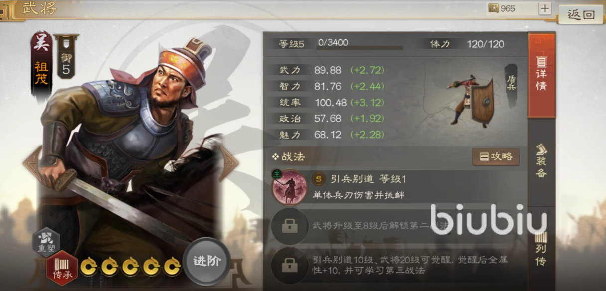 首先要给大家先带来的是基础面板和属性方面。祖茂其基础面板不高,除开统率以外,其他的属性都低于三点以下,在整个五星武将中属于中游水准,不过好在其都比较均衡,而且武力值也突破了2.5以上,来到了2.72成长。满红之后,其基础加持方面还是有一战之力的。