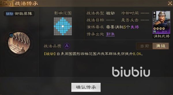 大家若想培养这个角色,可以先给他的御敌屏障战法先给升级一下,这个技能在他一级的时候可以对周边四格以内友军的免疫效果提高4.0%,如果大家给它升到满级的话,该免疫效果会从4%提升到8%,可以免疫掉敌人的短控等,缩短长控时间。