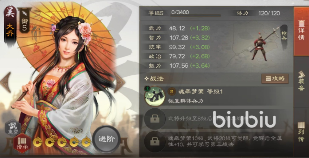 大乔在游戏内就是一个很典型的辅助型角色,虽然她的定位是枪兵,但是其攻击实力却是一点没有。智力超群,战法主要以恢复为主,可以快速恢复友方全体队员的兵力,而且能够帮助队友提升一定的战斗实力,属于一个不可多得的辅助型角色。