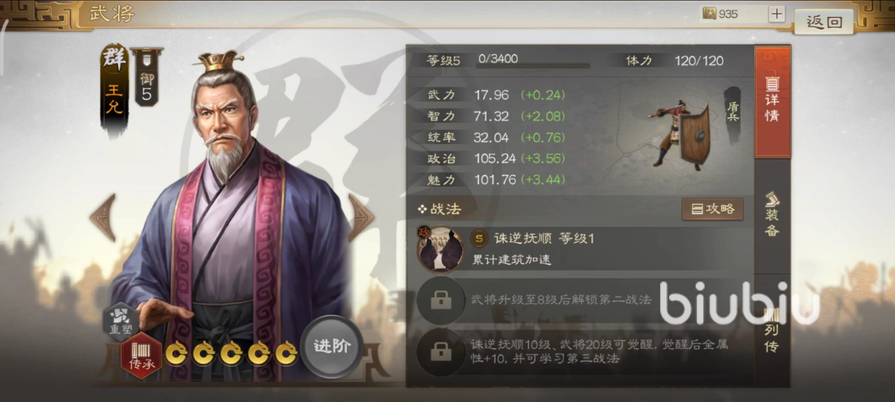 首先自身政治和魅力属性都非常高,这使其可以胜任任何一个位置的官员,都能带来极高加成。自身所携带战法效果,是当作为主政官时,可以提高建筑物升级效率,每小时都能获得大量加速时间,这样就使得主城中每一个建筑都能享受到加速所带来的优势。建筑物升级速度变快,自然影响了战力提高,而且前期有很多建筑都等待升级,有了王允帮助就能做到快人一步。但是到了后期建筑物全部到达满级之后,作用就会严重削弱,所以小编才说这是一个在前期越早获得就越有用的角色。