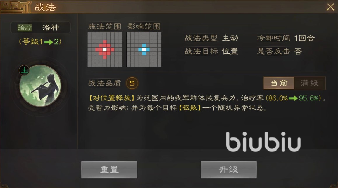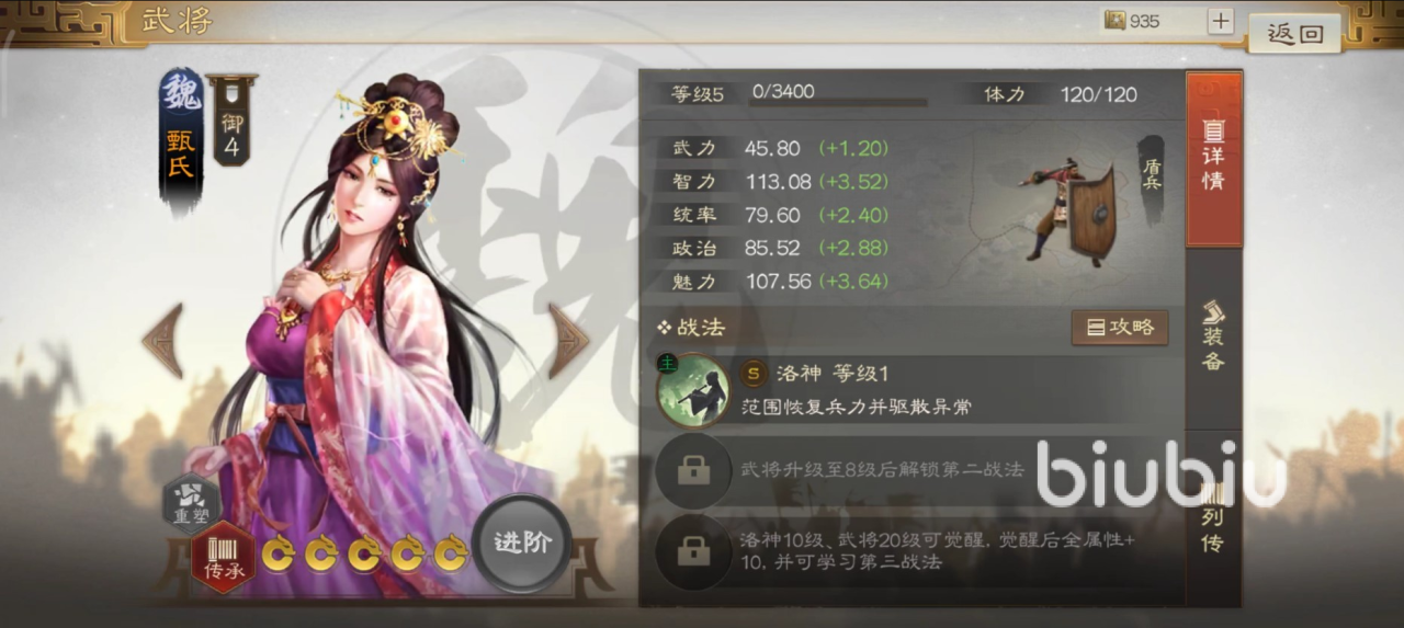 首先要明确这名武将并不是内政型将领,而是真正可以出战类型,自身属于盾兵在生存能力上有保障,而且拥有超高智力成长,是很多男性武将都不具备的优势。自带战法洛神,选中范围之后,为所作用到的友方武将恢复兵力,并且为每一个治疗目标都可以驱散身上所携带的不良状态影响,如果有多个不良状态,则随机选择驱散一个。这就使甄氏获得了治疗加驱散双重作用,是一个非常完美的辅助。