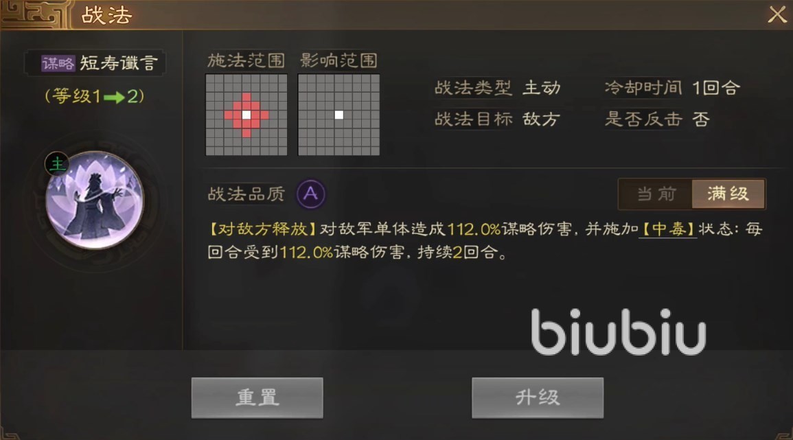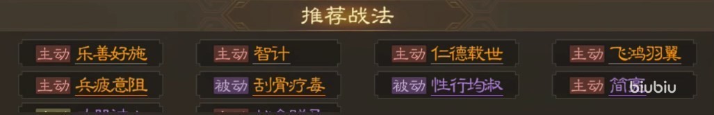 如果是作为作战武将登场,搭配一些其他输出向的技能,例如“乐善好施”“智计”来补充伤害。该战法更多时候适合传承给对负面状态有额外增益的武将,用来满足技能条件。
